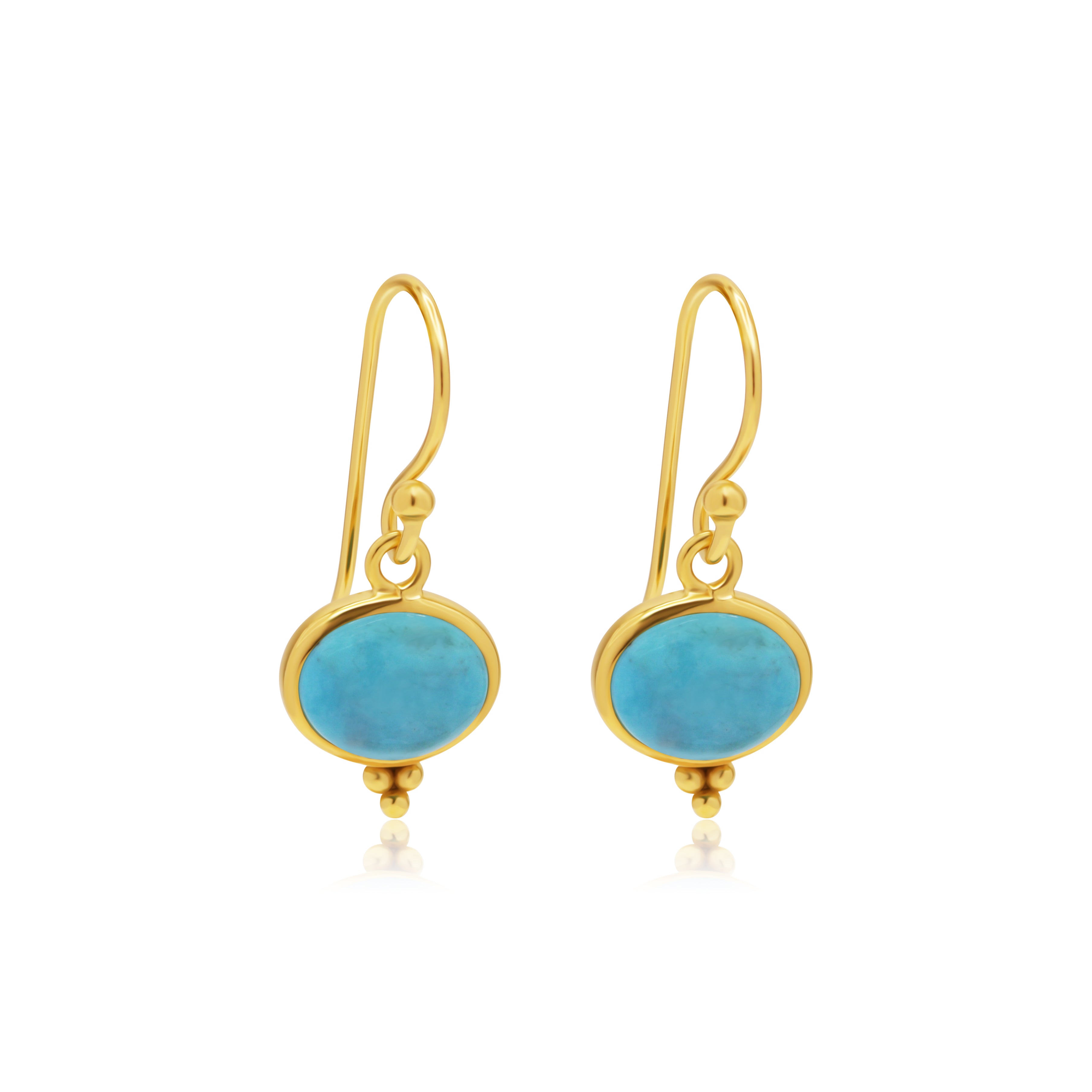 Introducing the captivating Aleta Earrings, a blend of exquisite craftsmanship and the protective energies of turquoise. Handcrafted with precision, these earrings feature stunning turquoise stones set delicately in 18K gold. Known for their ability to bring protection and good luck, each turquoise gemstone is a symbol of positive energy and serenity.