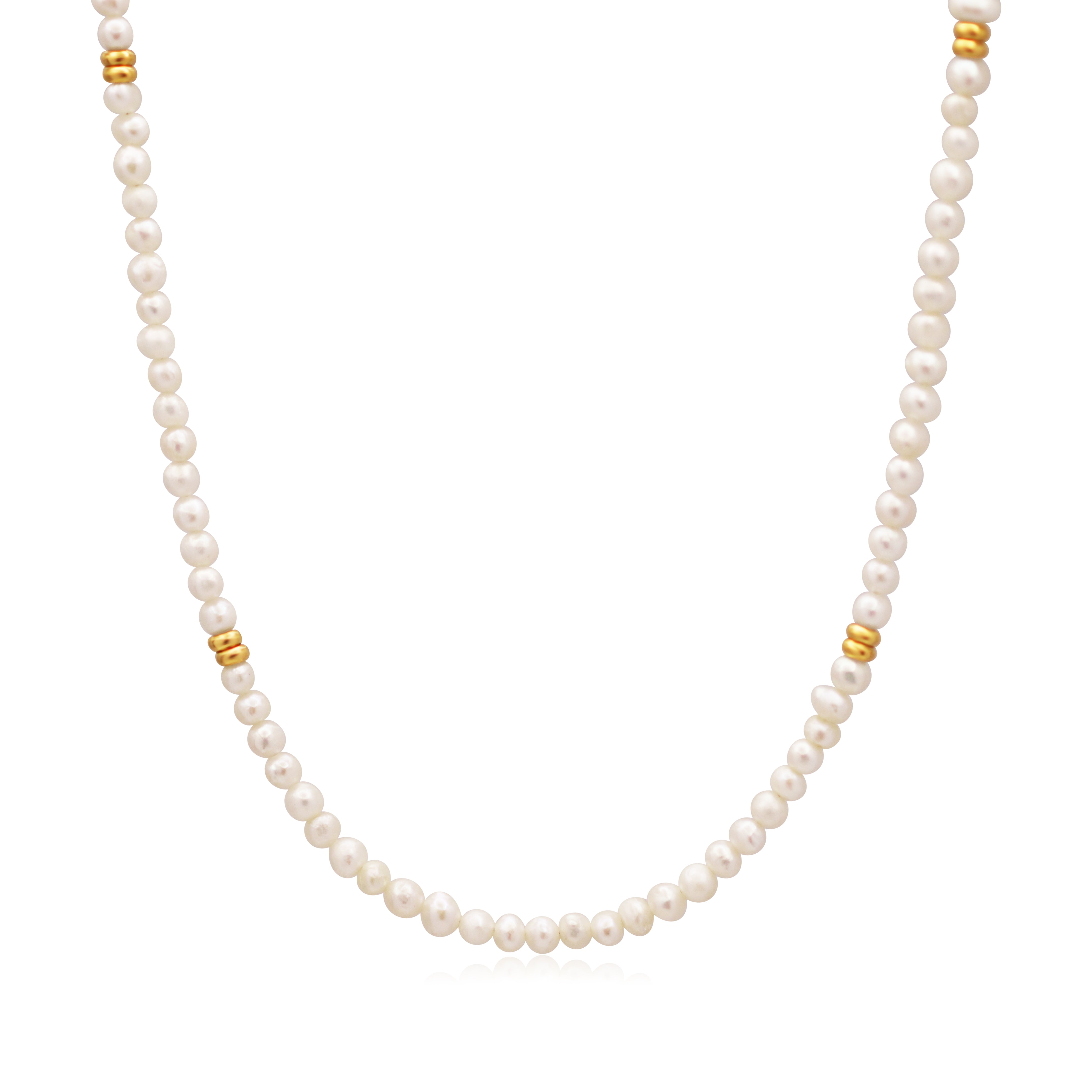 Elevate your everyday style with the Aura Necklace, a radiant blend of classic elegance and modern charm. Featuring beautifully beaded freshwater pearls accented with delicate gold pearls spaced evenly throughout, this piece brings a warm, luminous glow to any look. Finished with an 18k gold-plated clasp and an adjustable extender chain, it’s the perfect necklace for layering or wearing on its own for a soft, feminine touch.