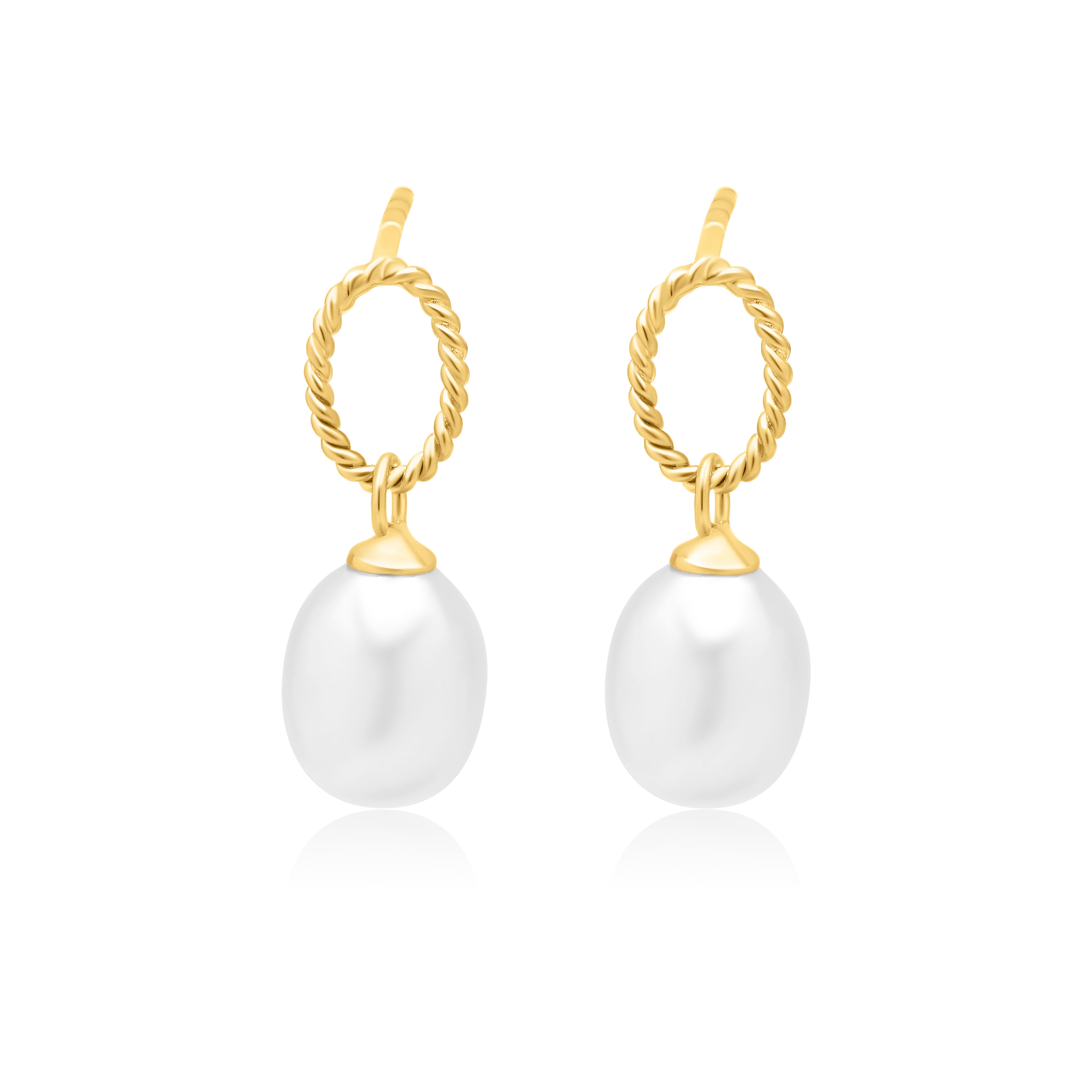 The Bonnie Gold Studs bring a touch of timeless elegance to your everyday look. Crafted in sterling silver with 18k gold plating, these delicate earrings feature a twisted oval drop with a dainty shell pearl suspended beneath, creating soft movement and a refined coastal charm. Perfect for dressing up or adding a little sophistication to your daily style.
