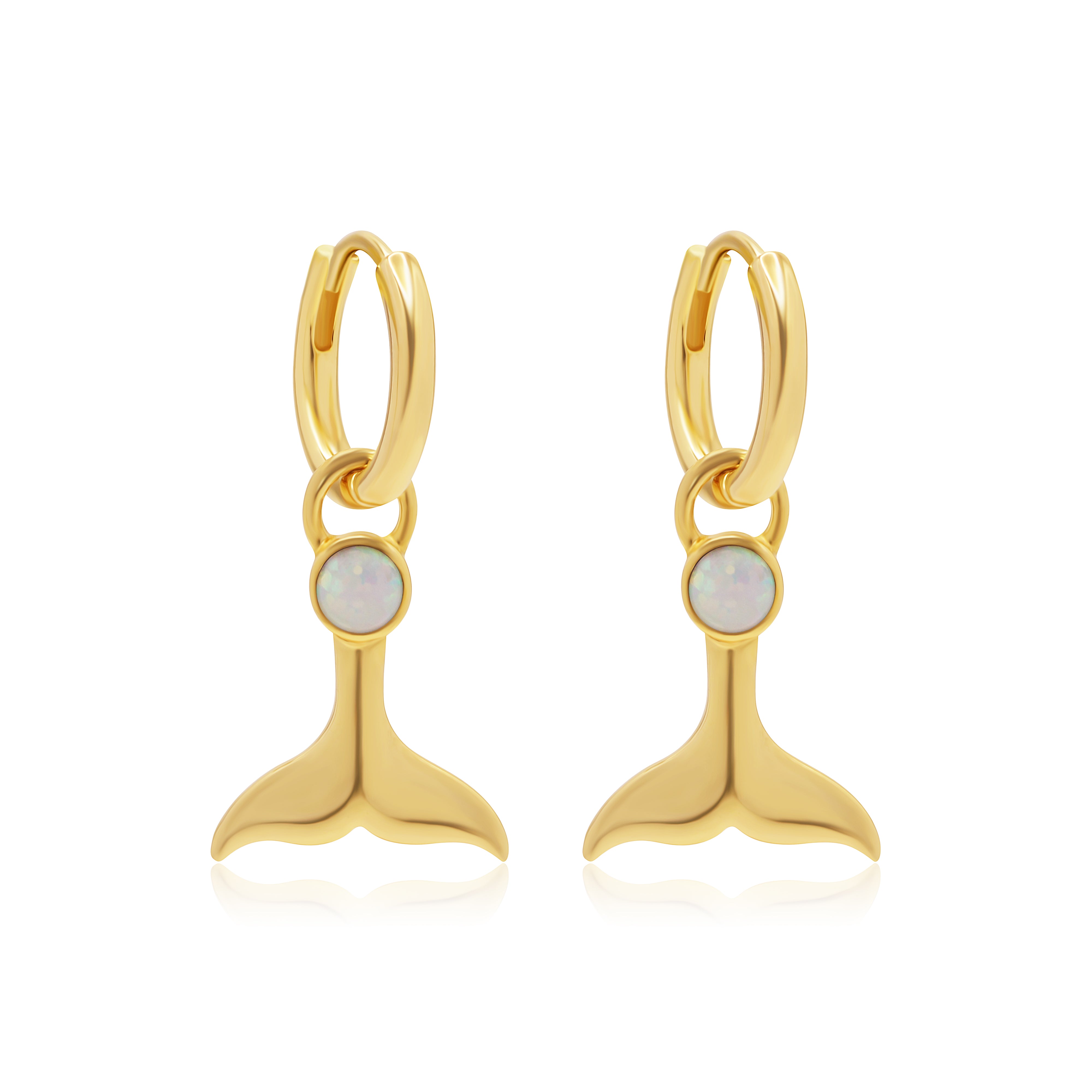The La Sirene White Opal Gold Hoops are made for ocean lovers and whale watchers at heart. Crafted in 18k gold-plated sterling silver, these playful hoops feature a detailed whale tail with dreamy white opal inlay. The comfy clip-in style means you can wear them all day, from beach hangs to dinner dates. These are your new go-to earrings.